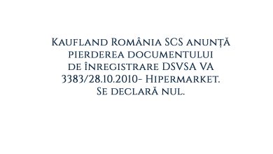 Kaufland România SCS anunță pierderea documentului de înregistrare DSVSA VA 3383/28.10.2010- Hipermarket. Se declară nul.