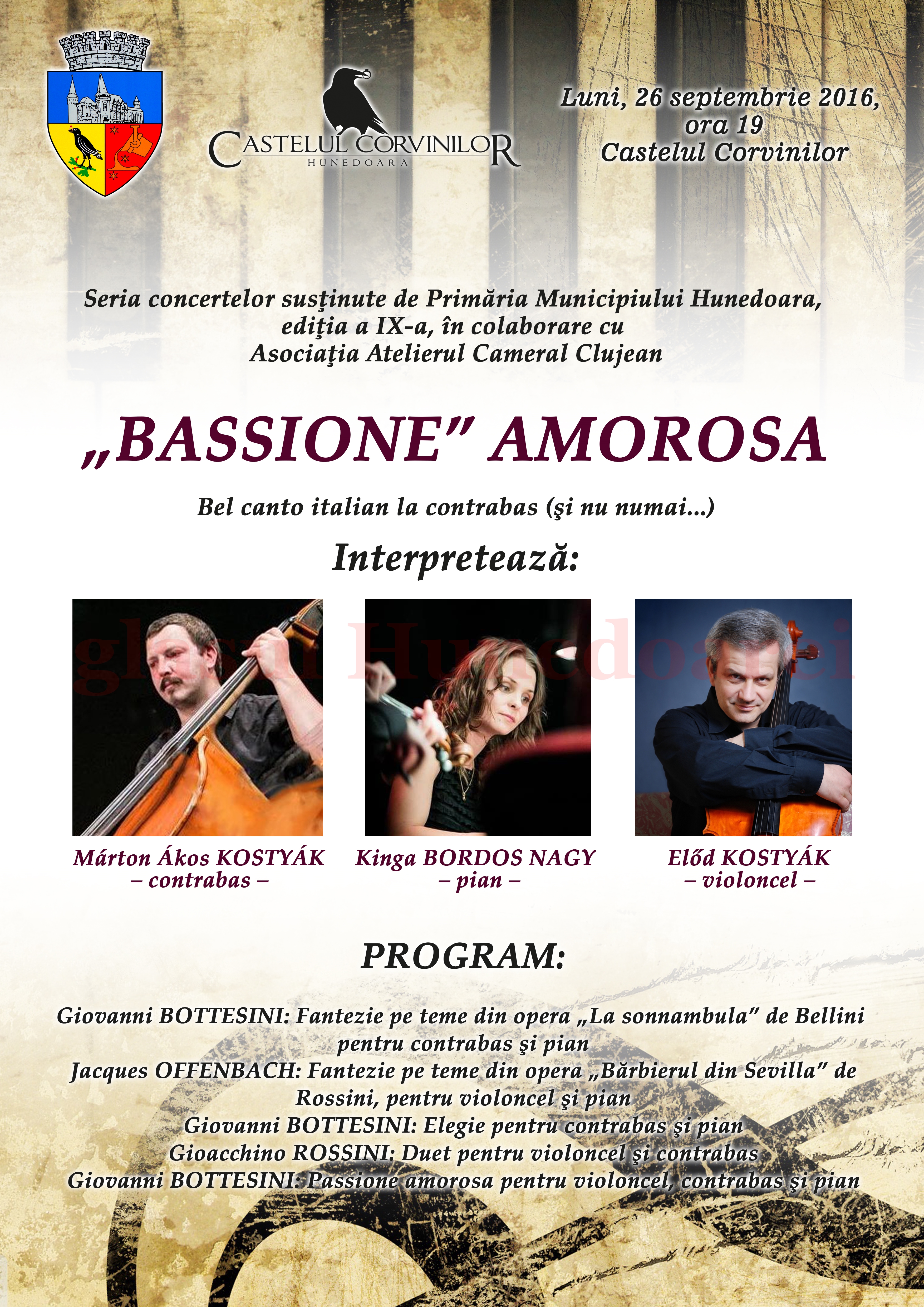 Melomanii din județ sunt invitați săptămâna viitoare la un eveniment cultural-artistic inedit. Este vorba despre un concert de muzică de cameră susținut de Márton Ákos Kostyák (contrabas), Kinga Bordos Nagy (pian) și Előd Kostyák (violoncel). Evenimentul, intitulat «„Bassione” Amorosa», se înscrie în seria concertelor organizate de către Primăria Municipiului Hunedoara în colaborare cu Asociația Atelierul Cameral Clujean. Din program amintim: Giovanni BOTTESINI – Fantezie pe teme din opera „La sonnambula” de Bellini pentru contrabas şi pian; Jacques OFFENBACH – Fantezie pe teme din opera „Bărbierul din Sevilla” de Rossini, pentru violoncel şi pian; Giovanni BOTTESINI: Elegie pentru contrabas şi pian; Gioacchino ROSSINI – Duet pentru violoncel şi contrabas; Giovanni BOTTESINI – Passione amorosa pentru violoncel, contrabas şi pian. Evenimentul are loc luni, 26 septembrie, de la ora 19:00, la Castelul Corvinilor. Intrarea este liberă.