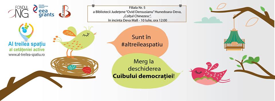 În data de 10 iulie 2015, Biblioteca Județeană „Ovid Densusianu” Hunedoara-Deva, Fundația Progress și grupul de voluntari format în cadrul proiectului „Al Treilea Spațiu al Cetățeniei Active” organizează o serie de evenimente pentru a marca deschiderea oficială a Cuibului Democrației din Deva. Acesta se înscrie într-o rețea de alte patru cuiburi ce vor fi lansate până la mijlocul lunii iulie în bibliotecile publice din Târgu-Jiu, Cluj-Napoca, Brașov și Suceava. Inspirate de „cuibul lecturii” creat de Mark Reigelman și folosind materiale în valoare de 1.600 EUR, cuiburile democrației din România sunt medii, ambiente sau chiar instalații amenajate de către voluntari pentru membrii comunității largi, pentru a încuraja și susține practicarea valorilor democrației: dialog, schimb de idei, participare activă. Cel din Deva se remarcă atât prin amplasarea neașteptată (într-un mall), cât și prin designul și elementele decorative neconvenționale. În cadrul evenimentului de vineri, membrii echipei de proiect și voluntarii Fundației Progress vor prezenta etapele amenajării cuibului, dotările și funcționalitatea acestuia, precum și programul de activități ce vor fi organizate pentru a atrage atenția publicului larg asupra acestui spațiu inedit.