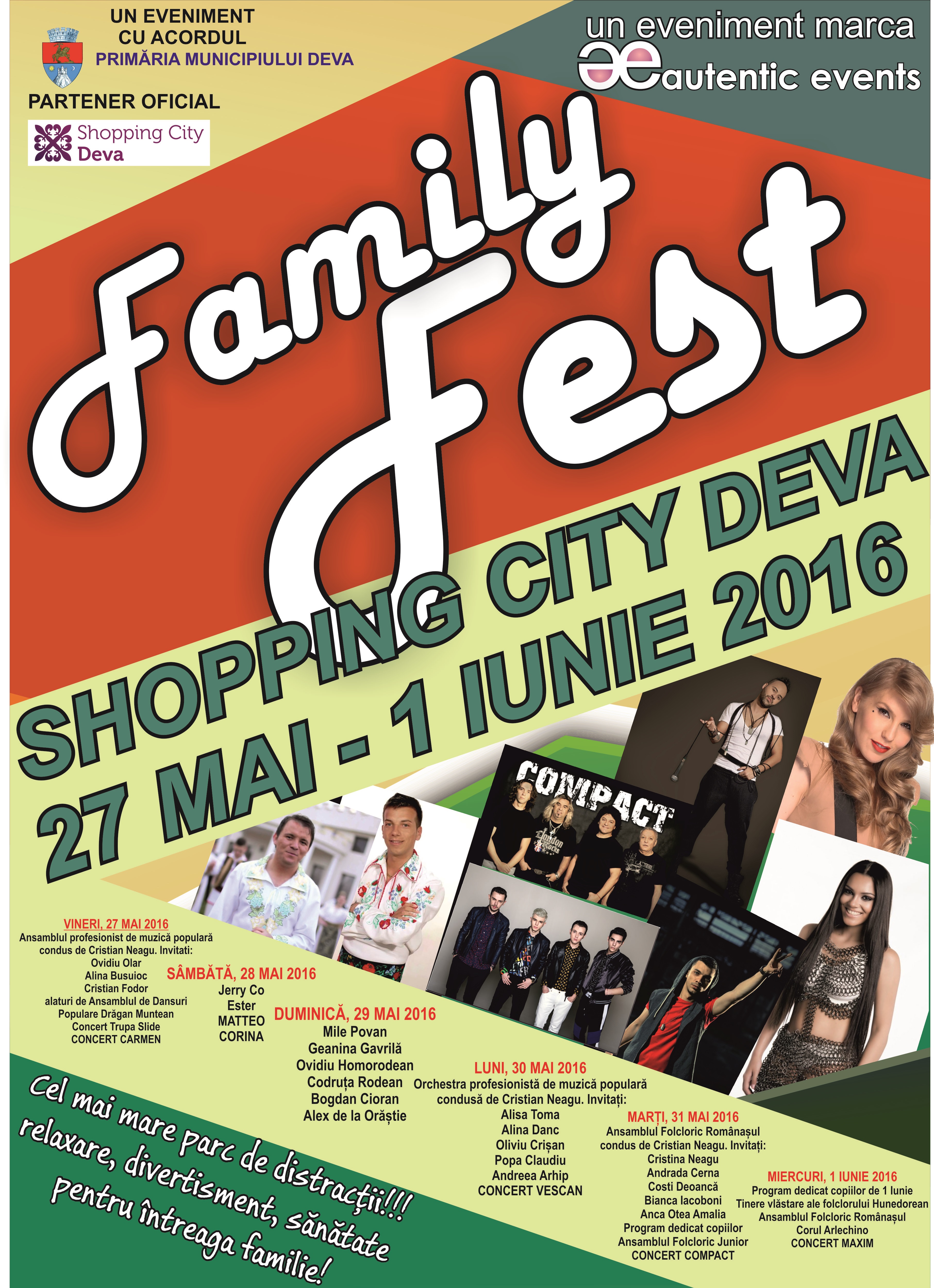 Timp de şase zile, în perioada 27 mai-1 iunie, la Shopping City Deva, hunedorenii au ocazia să ia parte la o serie de activităţi recreative, concursuri și concerte organizate în cadrul Family Fest, un festival dedicat familiei. Potrivit organizatorilor, pentru copii vor fi instalate, trenulețe, castele și tobogane gonflabile și carusele, dar nu vor lipsi nici concursurile care vor implica întreaga familie. Pentru părinți, organizatorii au pregătit cel mai mare parc de distracții și concerte în fiecare zi. Iar pentru o sărbătoare atât de specială a familiei, toți cei prezenți la festival vor fi invitaţi la un adevărat ospăț culinar la cele cinci terase amplasate în cadrul evenimentului. „Nu vor lipsi micii ce vor sfârâi pe grătarele încinse la maxim încă de la primele ore ale dimineții, dar și pastramă la grătar, pește, sărmăluțe în foi de varză și de viță, toate stropite cu bere din belșug. În plus, ca ospăţul să fie deplin, vă aşteptăm cu adevătare produse tradiționale: plăcinte şi cozonaci din toate zonele ţării, horincă ‹ca la mama ei acasă›, dulciuri, afumături, brânzeturi, dulcețuri, zacuscă și multe altele. Meşterii populari au venit şi ei la Sărbătoarea Familiei cu cele mai frumoase cadouri, exponate lucrate manual și produse de artizanat și marochinarie: blănuri, căciuli, bijuterii handmade, ceramică și pielărie. Totodată, atmosfera va fi întreținută cu muzică de petrecere și folclor tradițional, iar pe copii îi așteaptă distracție garantată în caruselele și trenulețele amplasate special pentru ei”, susţin organizatorii. Intrarea este liberă pentru toți cei care doresc să petreacă câteva ore de calitate, divertisment și relaxare în lumea specialităţilor culinare. Printre cei care vor susţine recitaluri şi concerte se numără Ovidiu Olar, Alina Busuioc, Cristian Fodor, alături de Ansamblul de Dansuri Populare Drăgan Muntean, Concert Trupa Slide, Concert Carmen, Matteo, Corina, Codruţa Rodean, Bogdan Cioran, Alex de la Orăştie, Popa Claudiu, Andreea Arhip, Concert Vescan etc.