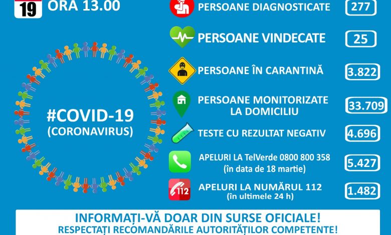 Până astăzi, 19 martie, pe teritoriul României, au fost confirmate 277 de cazuri de persoane infectate cu virusul COVID – 19 (coronavirus). Dintre cele 277 de persoane confirmate pozitiv, 25 au fost declarate vindecate și externate ( 16 la Timișoara, 8 la București și unul la Iași).