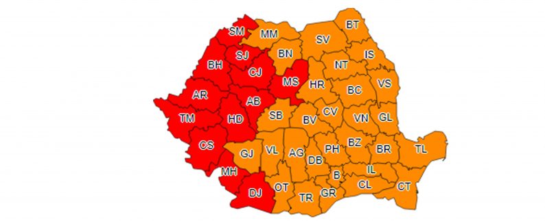 15 județe se află de ieri și vor și fi astăzi sub cod portocaliu de temperaturi ridicate: Dolj, Mehedinţi, Caraş-Severin, Timiş, Hunedoara, Alba, Sibiu, Arad, Bihor, Satu Mare, Maramureş, Sălaj, Cluj, Mureş şi Bistriţa Năsăud, restul țării find sub cod galben.