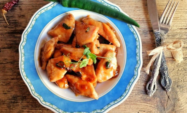 Luăm tigaia de pe foc şi scăldăm bucăţile de pui în glazura delicioasă.